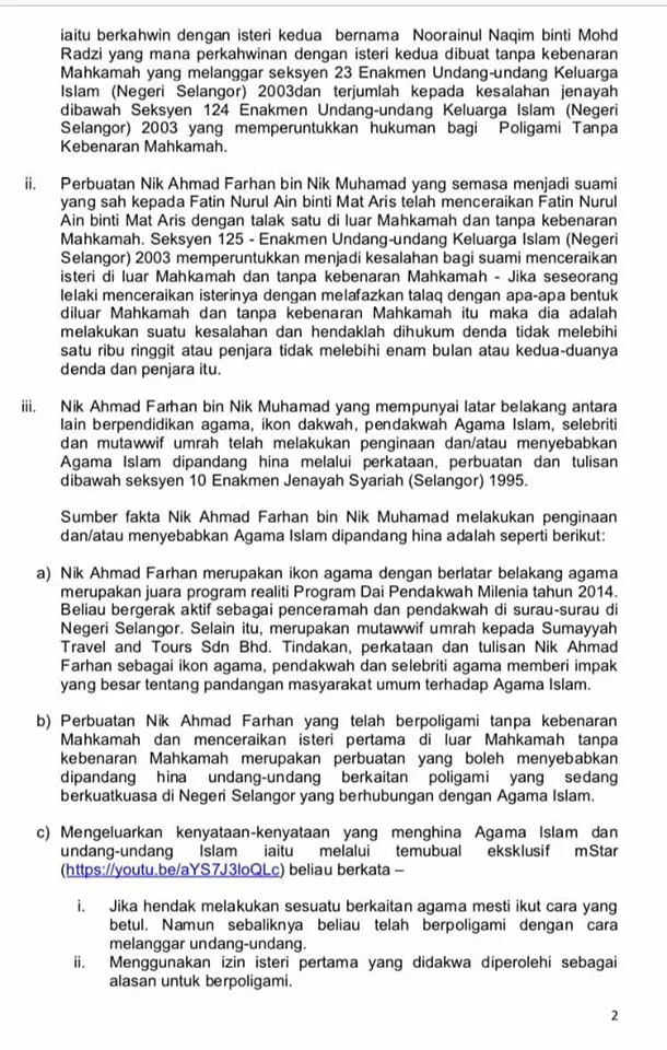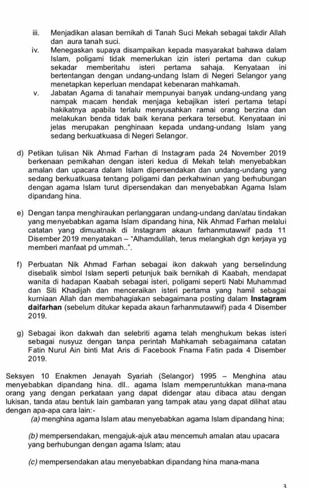 Tambah wanita itu, Farhan turut melakukan penghinaan yang boleh menyebabkan agama Islam dipandang hina melalui perkataan, perbuatan dan tulisan di bawah Seksyen 10 Enakmen Jenayah Syariah (Selangor) 1995.