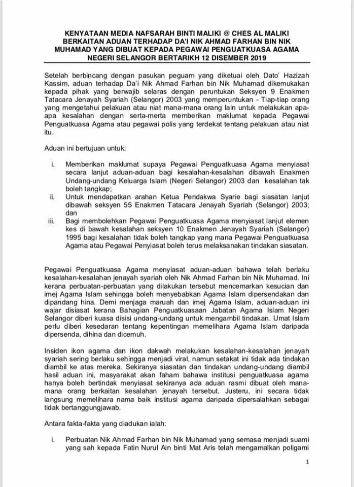 “Jadi, dengan aduan dibuat, pegawai penguat kuasa agama boleh memulakan siasatan lanjut berhubung kesalahan dilaporkan Nafrasah terhadap Nik Ahmad Farhan.