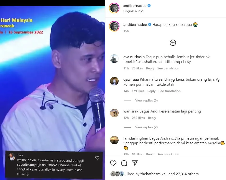 Andi berkongsikan kembali komen pemilik akaun tersebut di Instagram miliknya. Perkongsian Andi tersebut telah mendapat sokongan dari netizen dan rata-rata membidas kembali tindakan lelaki tersebut.