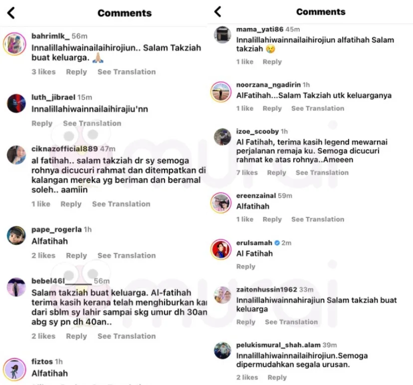 “Salam takziah buat keluarga, al-fatihah dan trima kasih kerana telah menghiburkan kami dari sebelum saya lahir sampai sekarang umur dh 30an, abg saya pun dah 40an”-tambah mereka