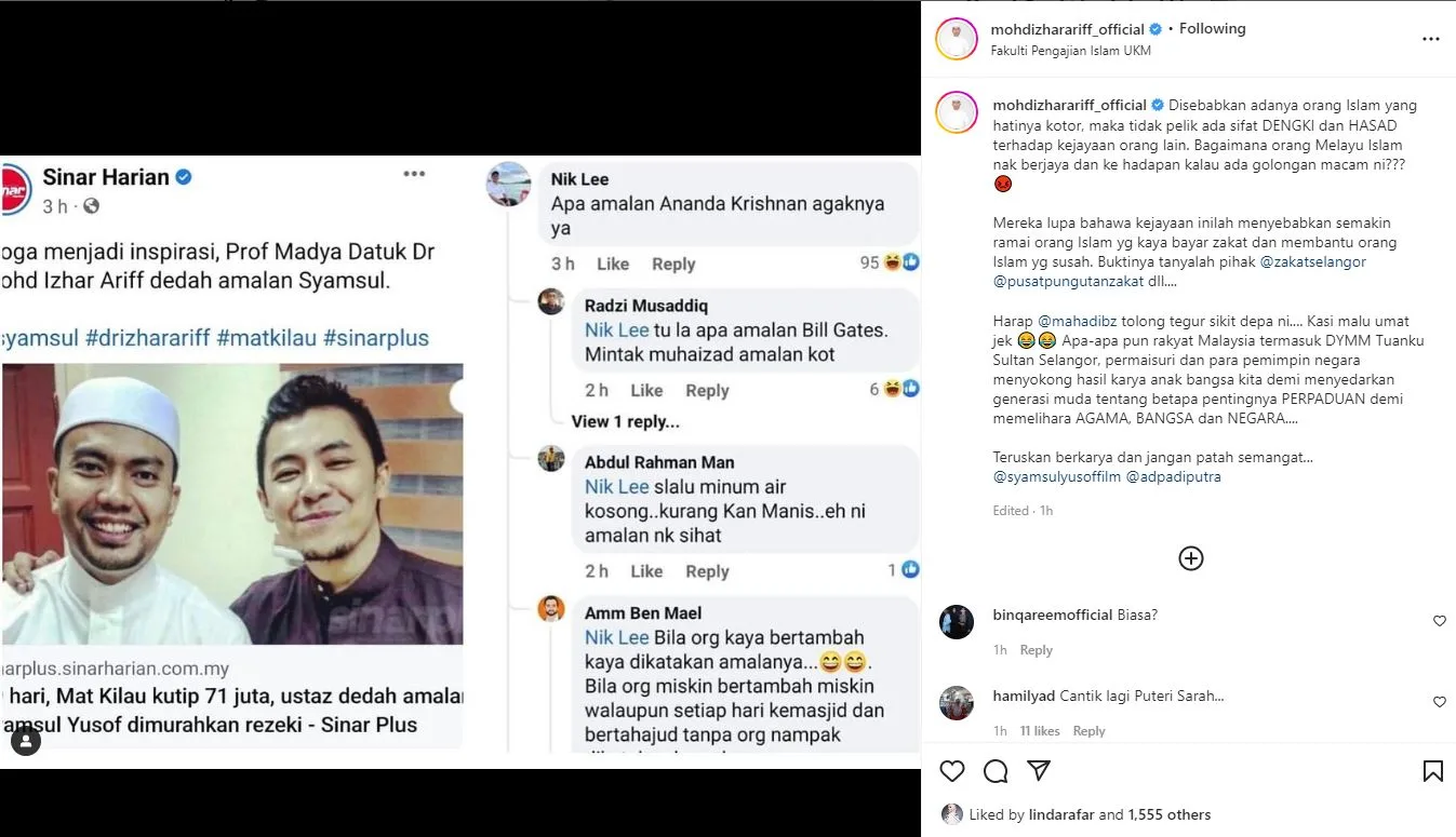 Di Instagram milik Ustaz Izhar, ustaz memaklumkan bahawa adanya golongan orang Islam yang hatinya kotor, maka tidak pelik ada sifat dengki dan hasad terhadap kejayaan orang lain.
