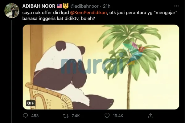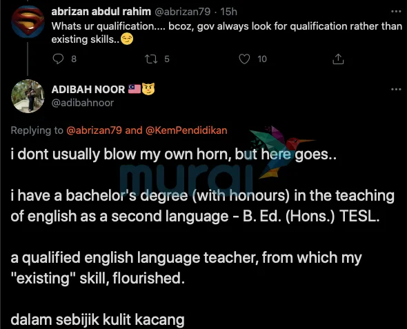 Tampil membalas ciapan tersebut, jelas Adibah dia merupakan seorang pemegang ijazah (dengan kepujian) pengajaran Bahasa Inggeris sebagai bahasa kedua (TESL) selain berpengalaman sebagai seorang guru bahasa Inggeris.