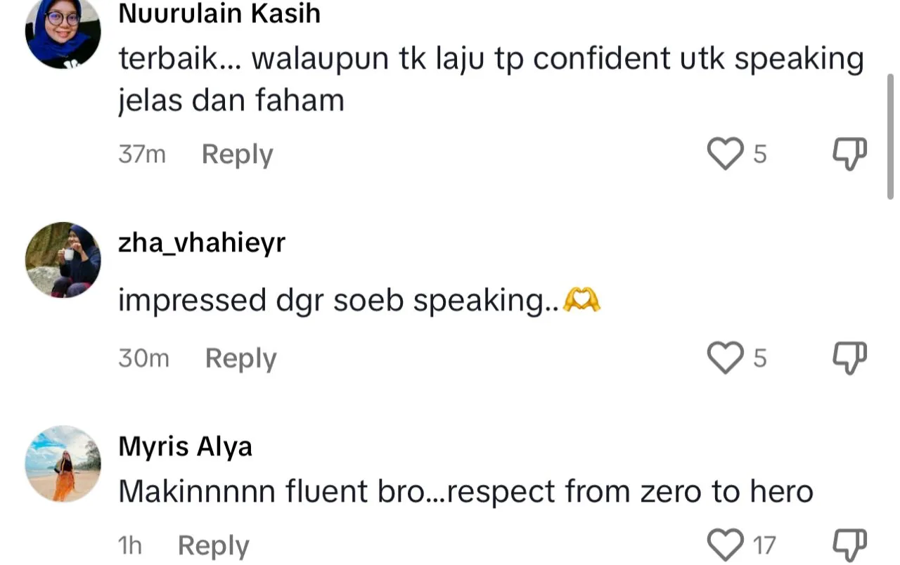 Menjengah ke ruangan komen, rata-rata warganet memuji keberanian pelawak kesayangan ramai itu kerana tidak malu untuk bertutur meskipun masih ada yang mentertawakan dirinya.