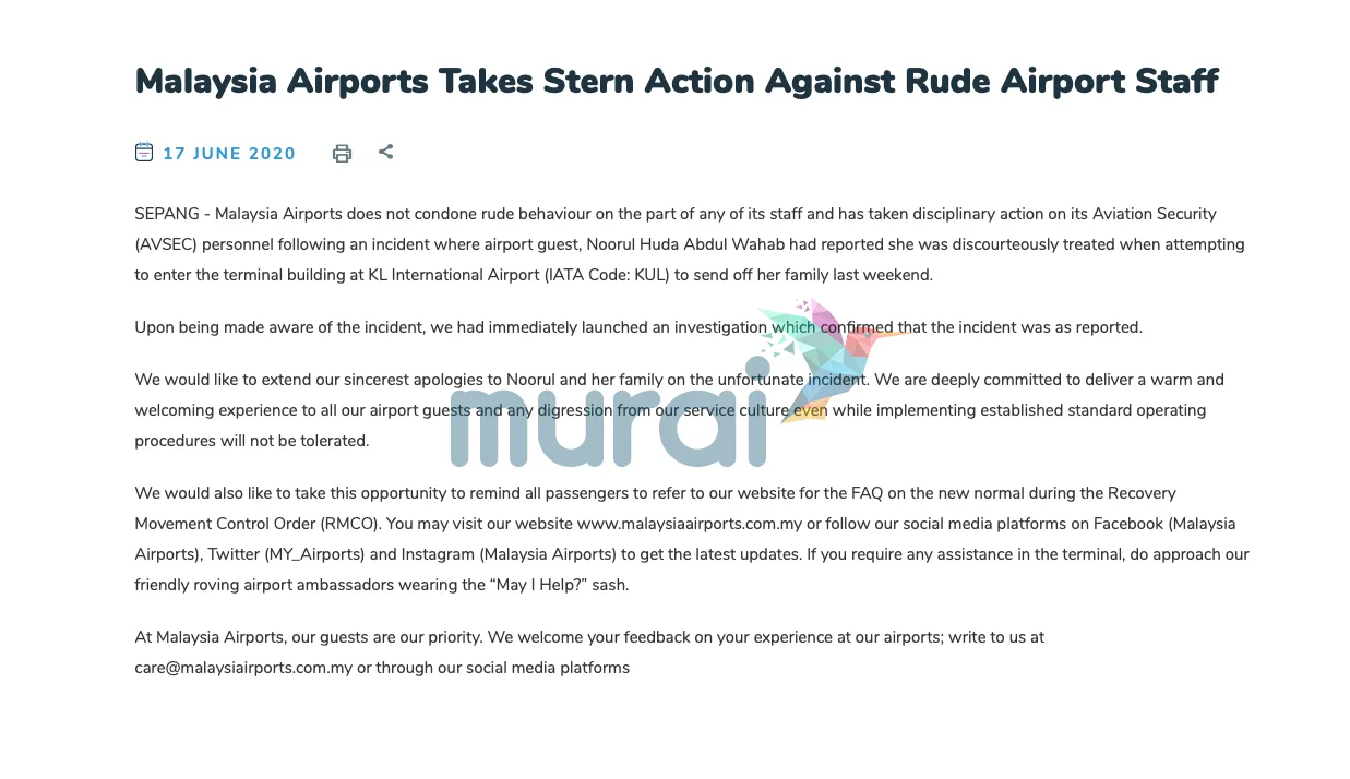 Susulan daripada itu,pihak Malaysia Airports Holding Berhad (MAHB) menerusi satu kenyataan di laman Facebook mereka telah memohon maaf kepada Nourul dan keluarga atas layanan buruk yang diterimanya. Dalam kenyataan itu, MAHB memaklumkan mereka telah mengambil tindakan tatatertib ke atas petugas berkenaan dan sama sekali tidak akan membiarkan sikap seperti itu wujud di kalangan kakitangan mereka.