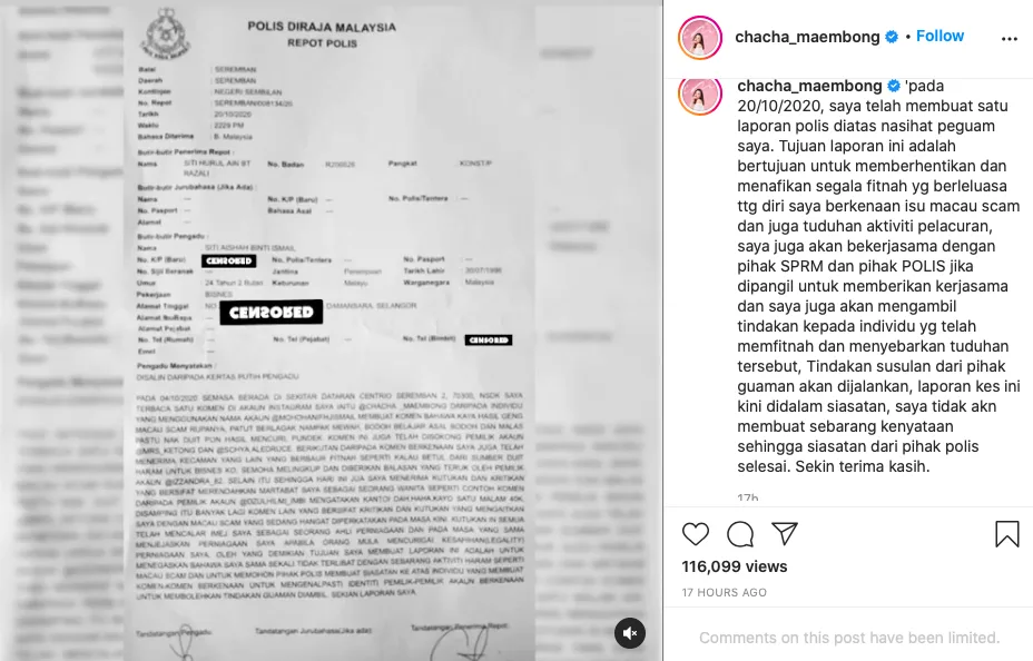 “Tujuan laporan ini adalah bertujuan untuk memberhentikan dan menafikan segala fitnah yang berleluasa tentang diri saya berkenaan isu Macau Scam dan juga tuduhan aktiviti pelacuran” kongsinya