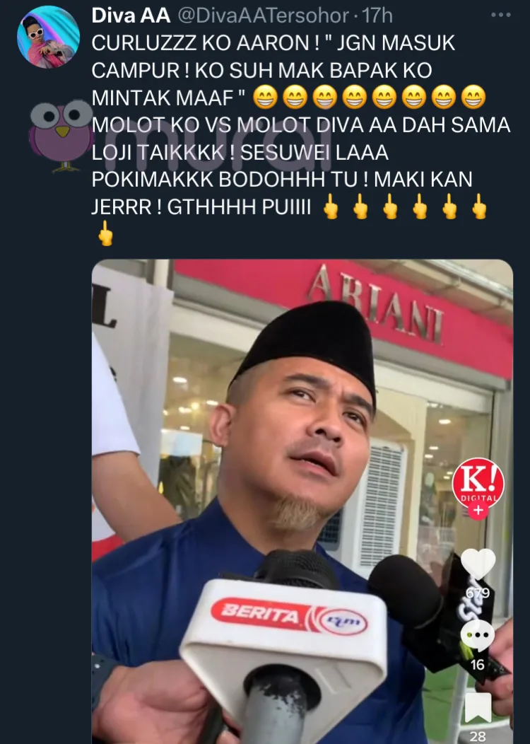 “CURLUZZ KO AARON! ‘JANGAN MASUK CAMPUR! KO SUH MAK BAPAK KO MINTA MAAF’. MULUT KO VS MULUT DIVA AA DAH SAMA LOJI TAIKK!