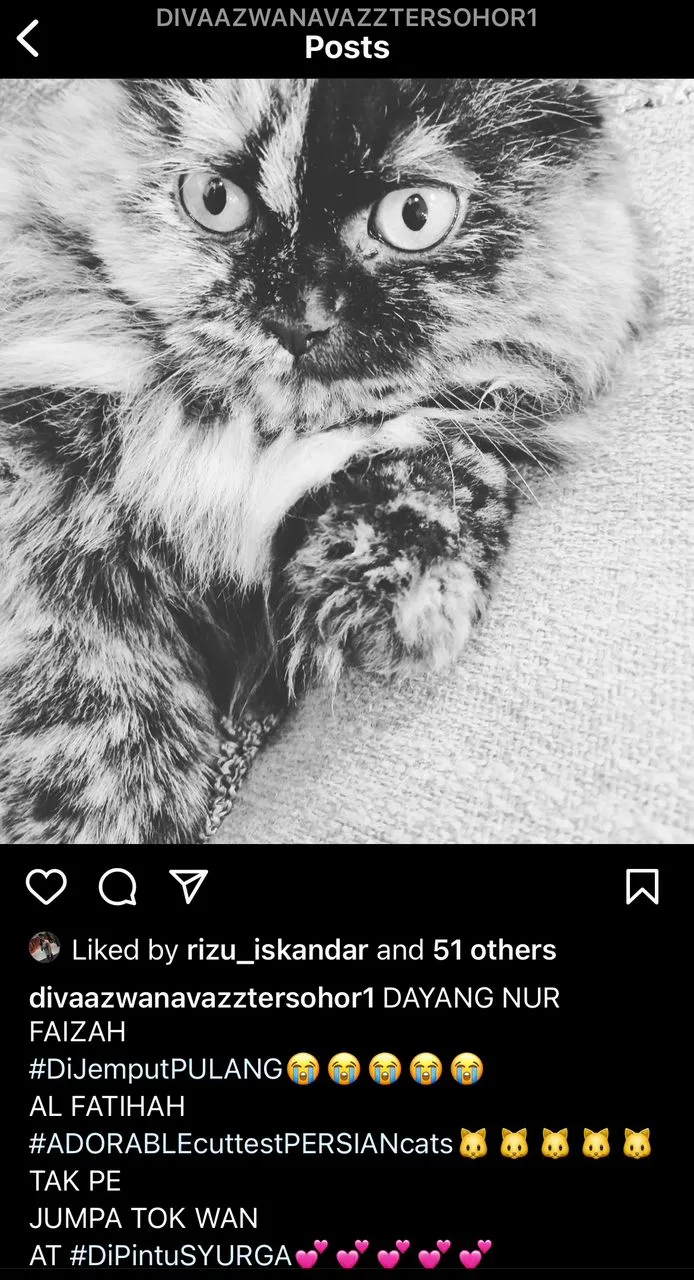 “Terima kasih kepada mereka yang turut bersimpati dengan saya. Doakan kucing saya yang lain iaitu Aaron Aziz, Hang Tuah, Lim Guan Eng, Ziana Zain dan Rosmah Mansor terus sihat. ” katanya lagi