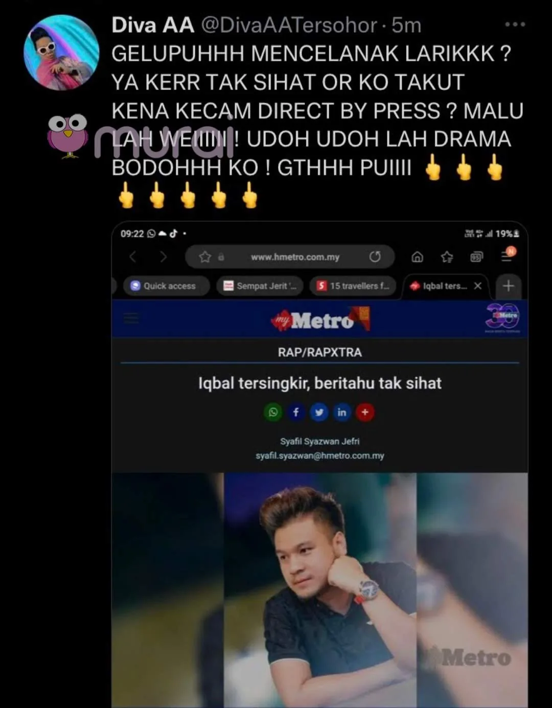 Menerusi laman Twitter, Diva AA turut mempersoalkan Iqbal adakah dia benar-benar tidak sihat atau takut dikecam media sewaktu sidang media berlangsung.
