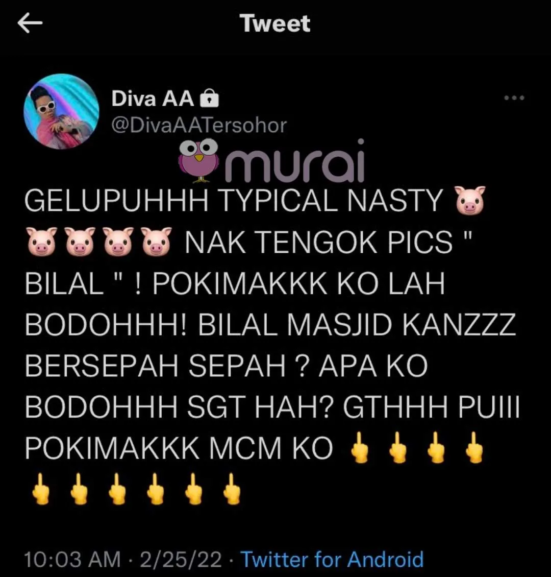 BILAL MASJID KANZZ BERSEPAH SEPAH? APA KO BODOH SANGAT HAH? GTHH PUII POKIMAK MACAM KO”- tegur Diva AA