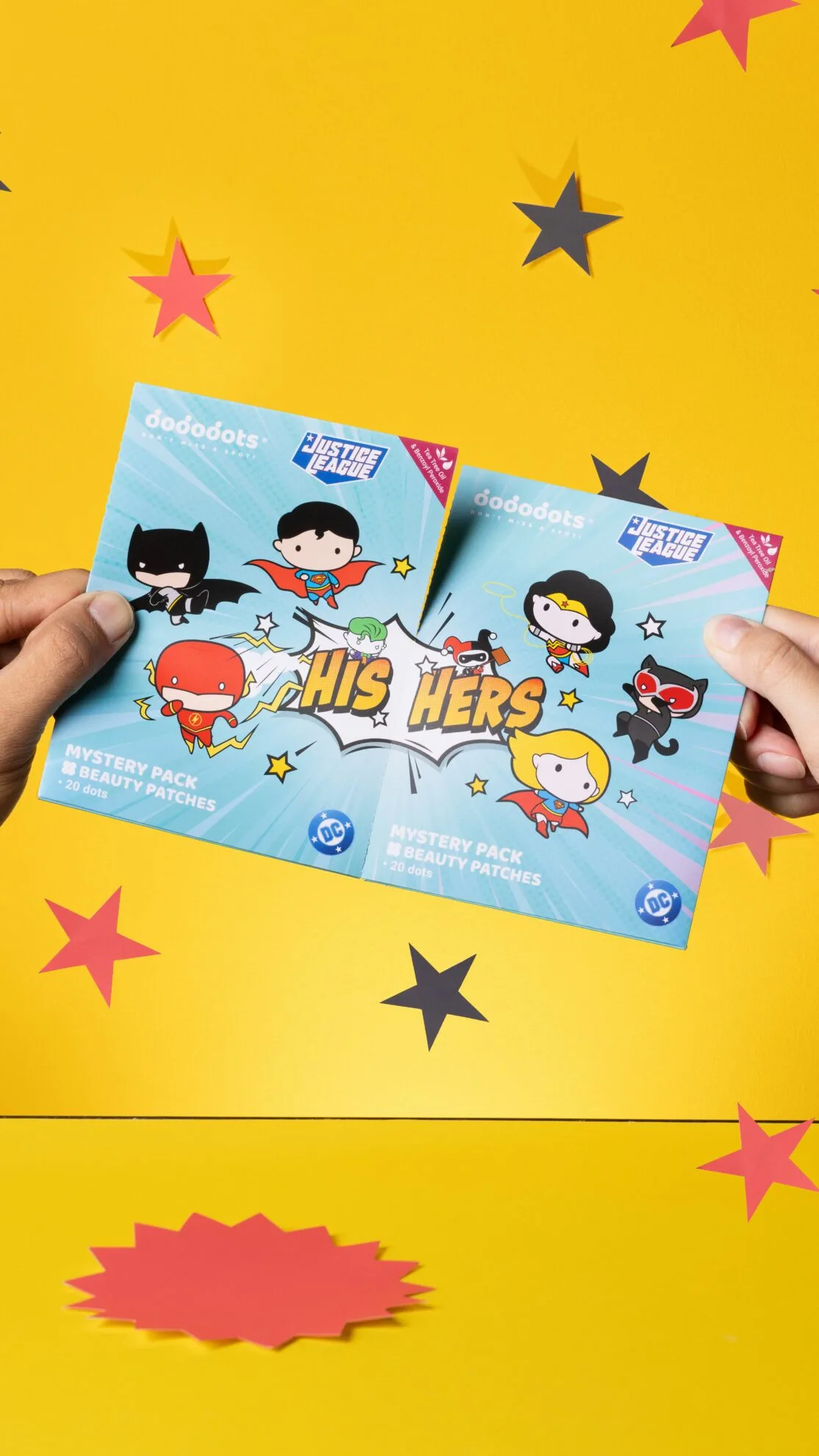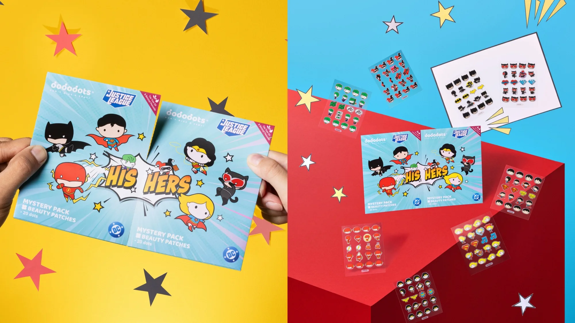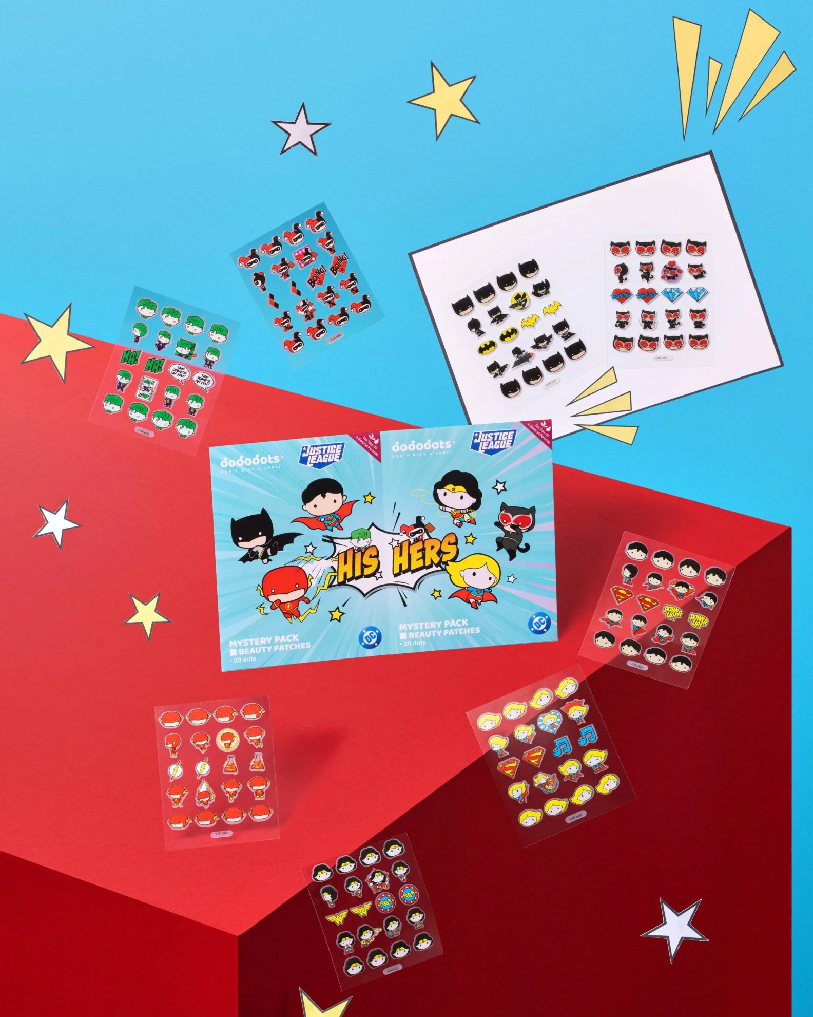 Satu bahagian menampilkan karakter kegemaran peminat seperti Batman, Superman, The Flash, dan Joker, manakala bahagian lain termasuklah karalter wanita seperti Wonder Woman, Supergirl, Catwoman, dan Harley Quinn. Setiap kotak mengandungi dua set, masing-masing terdiri daripada 25 rekaan pelekat jerawat yang unik, menjadikan blindbox ini cara yang menyeronokkan untuk menjaga kulit anda dan mempamerkan karakter wira atau penjahat kegemaran anda.