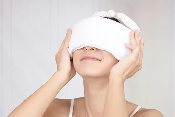 #2 Kemudian, penggunaan cool compress sangat penting. Untuk hasilkan cool compress, kamu boleh basahkan kain yang bersih dengan air yang sangat sejuk. Selepas itu, dalam keadaan duduk, kamu tekan cool compress dengan lembut pada kawasan mata selama beberapa minit. Selain kain basah yang sejuk, boleh juga digantikan dengan ais.