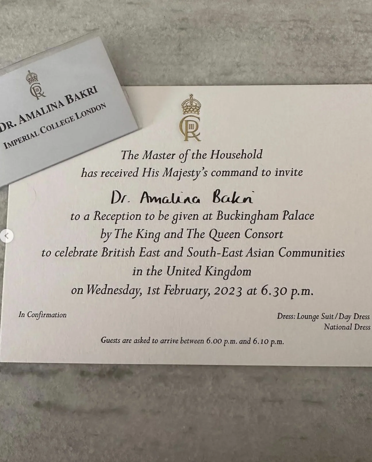 Amalina menulis, ini merupakan satu penghormatan kepada beliau untuk mewakili Malaysia hadir ke majlis resepsi di Istana Buckingham.