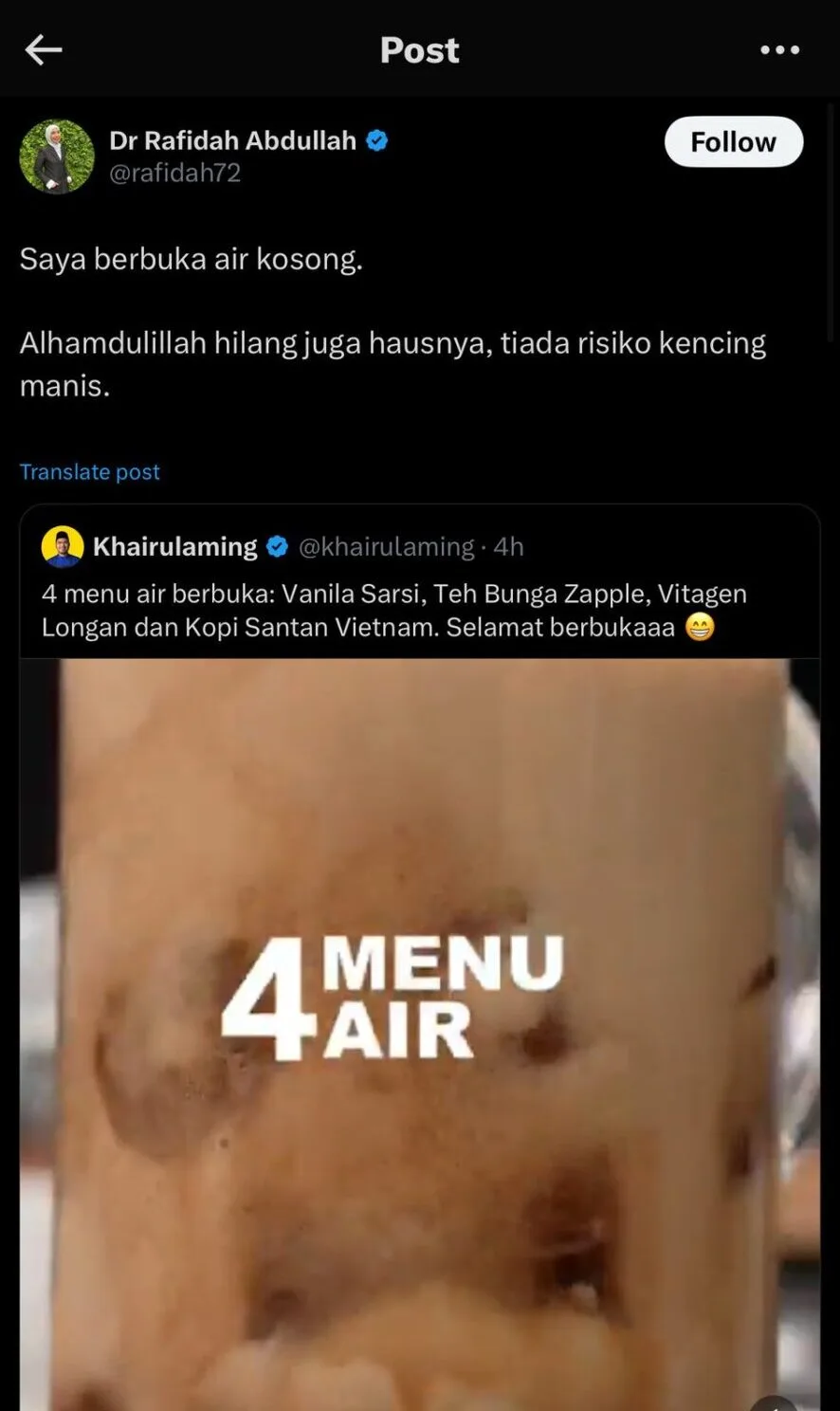 Dr Rafidah, menerusi hantaran di X dilihat melakukan quote retweet pada hantaran Khairul Aming dengan memaklumkan bahawa dia berbuka puasa dengan mengambil air kosong yang tiada risiko kencing manis.
