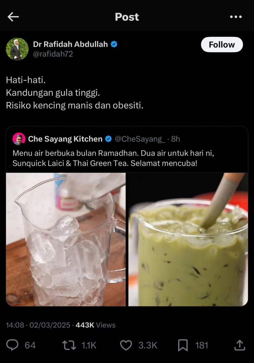 Dalam pada itu, pakar kesihatan ini turut mengingatkan orang ramai untuk berhati-hati risiko menghidap kencing manis dan obesiti jika mengambil minuman manis berlebihan selepas melakukan quote retweet pada hantaran pempengaruh masakan, Che Sayang Kitchen.