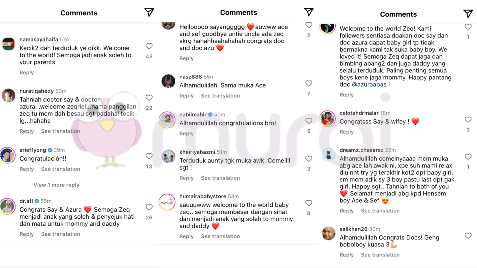 “Welcome to the world Zeq! Kami followers sentiasa doakan doc say dan doc azura dapat baby girl tapi tidak bermakna kami tak suka baby boy. We loved it! Semoga Zeq dapat jaga dan bimbing abang-abang dan juga daddy yang selalu terduduk. Paling penting semua boys kene jaga mommy. Happy pantang doc @azuraabas !.”