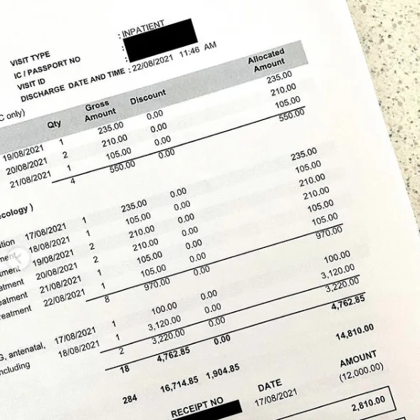 “Seperti yang dijanjikan, inilah dia bil hospital baby Sef. Masa bersalin Ace dulu untuk 4 hari 3 malam bil hospital was RM20k, jadi bila kami kena tahan 6 hari 5malam kali ni, saya menjangkakan yang bil akan jadi around RM25k but i was wrong. Lepas tolak discount, bil kali ni was RM15k. Yes ada discount kat SJMC.”-ujarnya.