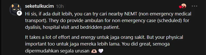 Dalam masa yang sama, ada juga yang mencadangkan penggunaan perkhidmatan pengangkutan perubatan bukan kecemasan bagi memudahkan urusan ke hospital.