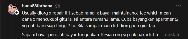 Ada yang berpendapat masalah ini berpunca daripada kegagalan sebahagian penghuni membayar yuran penyelenggaraan, sekali gus menyebabkan dana tidak mencukupi untuk membaiki fasiliti penting seperti lif.