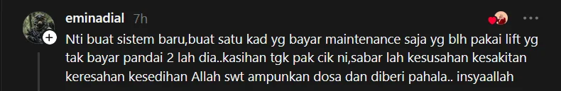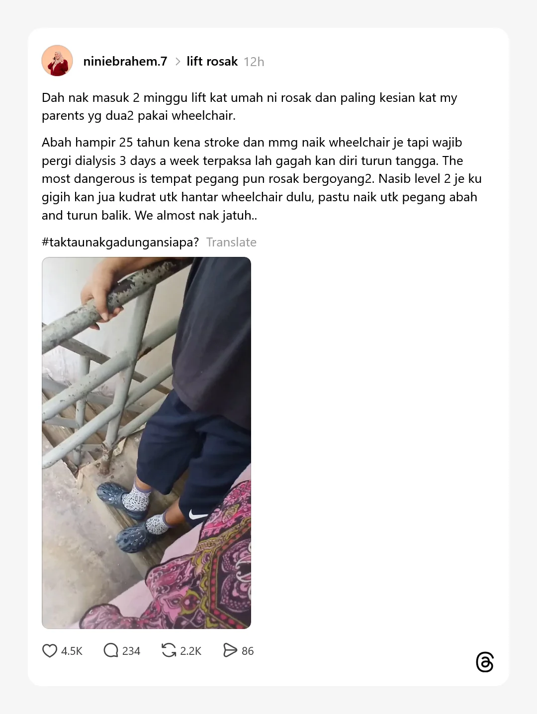 Kisah ini jelas menyentuh emosi ramai dan bukan sekadar simpati, tetapi juga kesedaran bahawa kemudahan asas seperti lif bukanlah satu kemewahan, sebaliknya keperluan kritikal.
