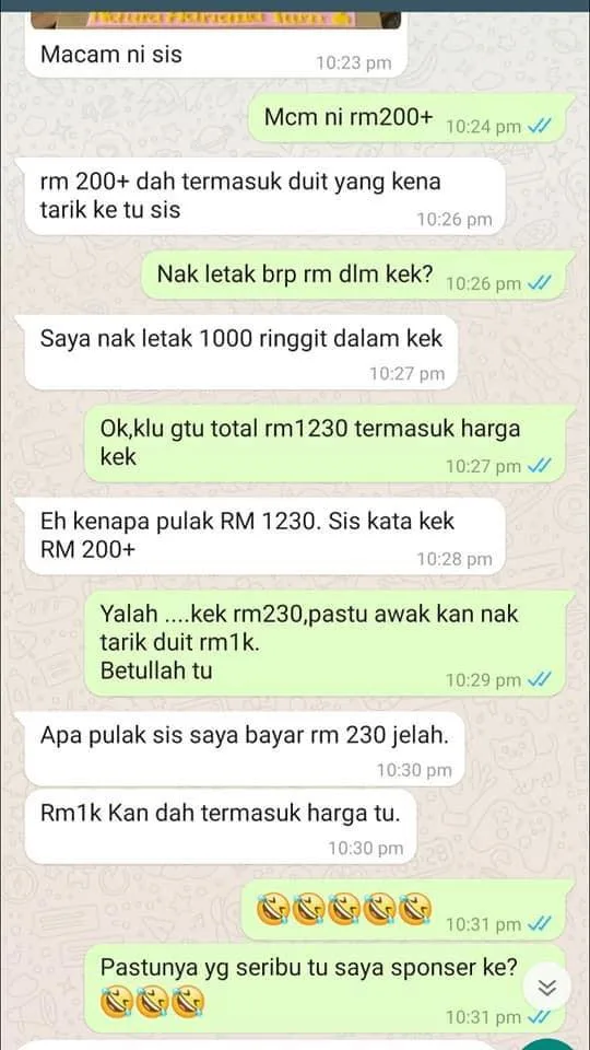 Pembuat kek itu kemudian mengatakan bahawa jumlahnya akan menjadi RM1,230 untuk kek itu. Pelanggan terkejut kerana menyangka wang RM1,000 yang terdapat di dalam kek itu disertakan dengan harga RM230.