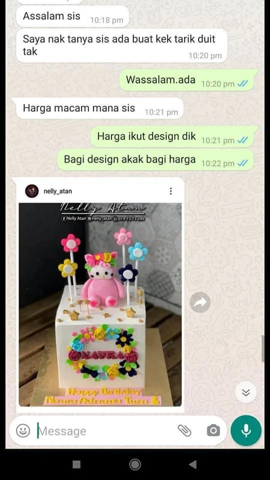 Pelanggan kemudian menghantar gambar reka bentuk kek, yang mana pembuat kek memberikan anggaran harga lebih dari RM200. Pelanggan kemudian bersetuju dan memberitahu bahawa dia ingin memasukkan kira-kira RM1,000 ke dalam kek.