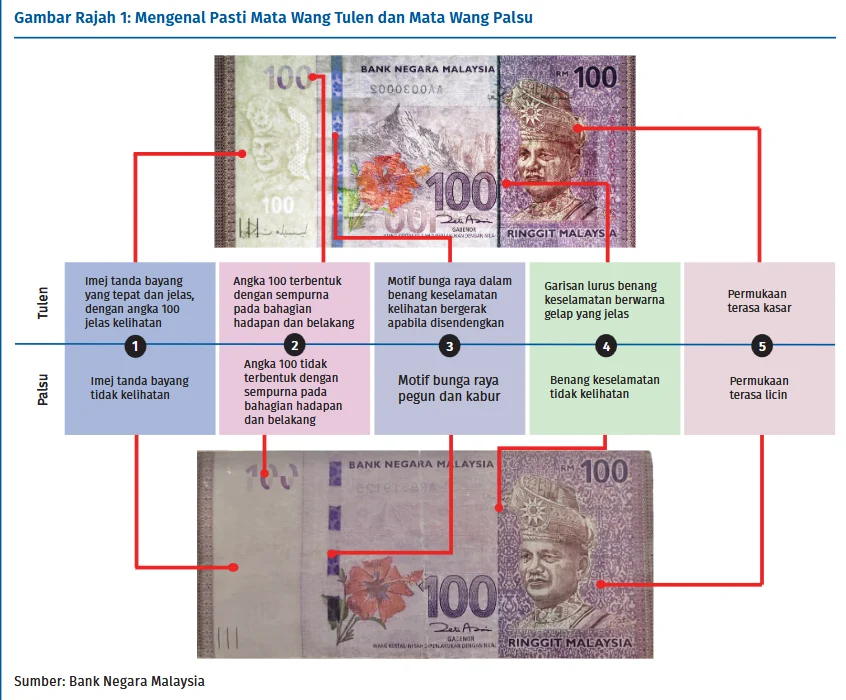 Antara tanda yang sering dikongsi termasuk tekstur wang yang terlalu licin, warna yang pudar atau tidak sekata, serta ciri keselamatan yang tidak jelas.