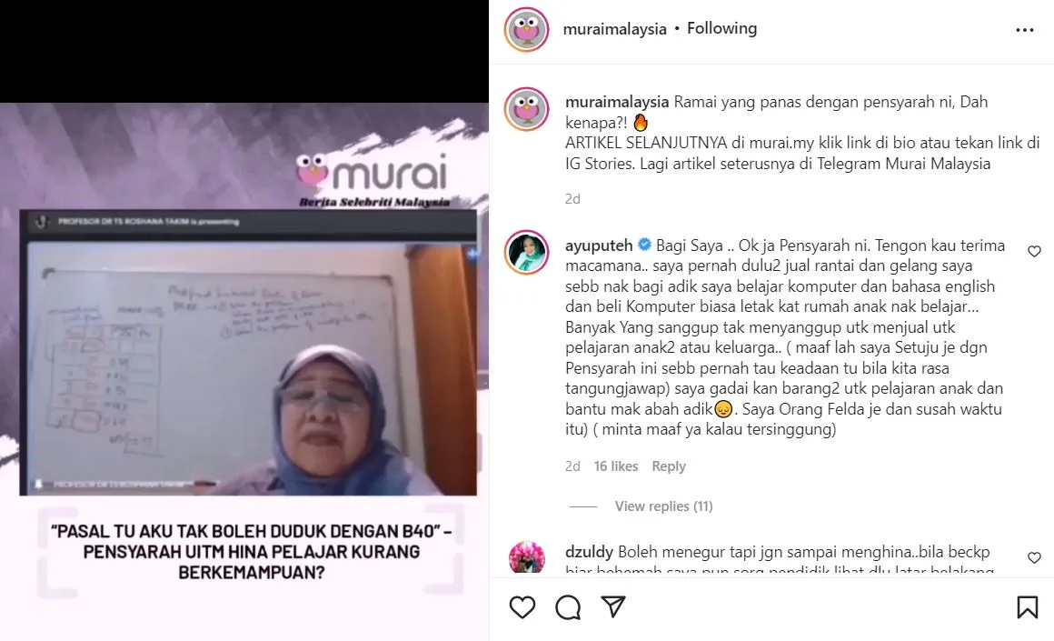 Sebelum ini Murai MY ada berkongsikan satu artikel mengernai kejadian yang berlaku. Menerusi ruang komen di instagram Murai MY, Penerbit Datuk Ayu Puteh turut mengulas dengan isu yang telah berlaku tersebut.