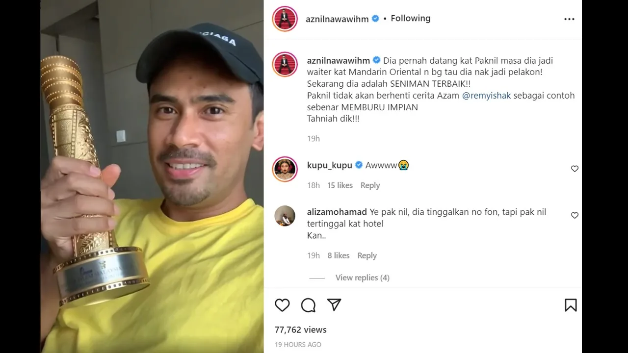 Kejayaan tersebut turut dikongsi oleh pengacara, pelakon, penyanyi, pengarah dan bekas penyampai radio di Malaysia, Datuk Aznil Hj Nawawi menerusi laman Instagram miliknya. Kongsi Pak Nil, pada awalnya Remy Ishak yang merupakan ‘waiter’ di Mandarin Oriental datang kepadanya untuk memberitahu niatnya untuk menjadi pelakon.