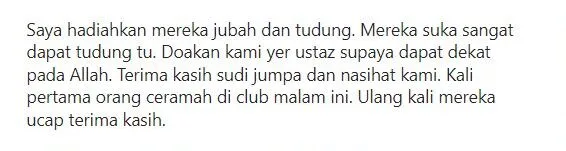 “Saya hadiahkan mereka jubah dan tudung. Mereka suka sangat dapat tudung tu. Doakan kami yer ustaz supaya dapat dekat pada Allah. Terima kasih sudi jumpa dan nasihat kami. Kali pertama orang ceramah di club malam ini. Ulang kali mereka ucap terima kasih” -tulisnya