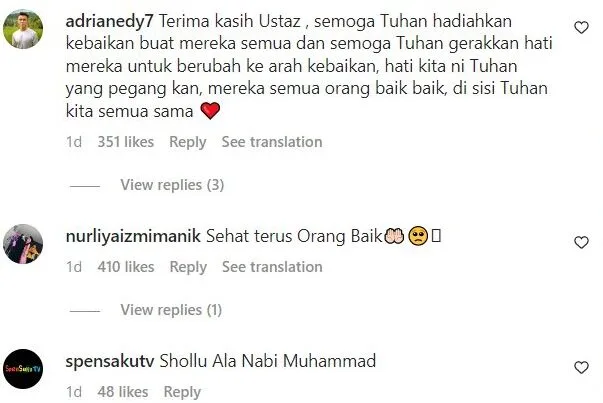Terima kasih Ustaz , semoga Tuhan hadiahkan kebaikan buat mereka semua dan semoga Tuhan gerakkan hati mereka untuk berubah ke arah kebaikan, hati kita ni Tuhan yang pegang kan, mereka semua orang baik baik, di sisi Tuhan kita semua sama -netizen