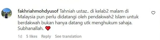 “Tahniah ustaz.. di kelab2 malam di Malaysia pun perlu didatangi oleh pendakwah2-pendakwah Islam untuk berdakwah bukan hanya datang untuk menghukum sahaja.