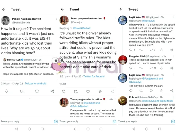 “Apa-apa pun, jika anda memandu dalam had kelajuan, ia tidak akan membunuh mangsa. Macam mana kelajuan anda boleh bunuh 8 mangsa dalam satu masa? Ya! Mangsa pun bersalah bila merempit basikal lajak di jalanraya di tengah malam. Tapi bolehkah dia bunuh kalau kelajuan dalam had limit?” ciap mereka