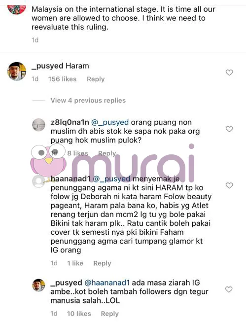 Dalam pada itu, di laman Instagram, seorang bekas ratu cantik Malaysia iaitu Deborah Henry semalam mempersoalkan kenapa wanita Islam di Malaysia tidak dibenarkan menyertai pertandingan tersebut.