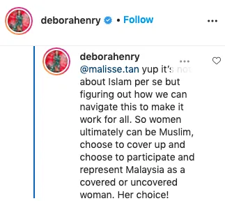 Kenyataan yang dikeluarkan oleh wanita berusia 35 tahun seperti disambut baik oleh peminatnya termasuklah di kalangan selebriti. Di ruangan komen, Deborah turut berkata, wanita di Malaysia mempunyai hak untuk diri mereka untuk menyertai pertandingan ini.