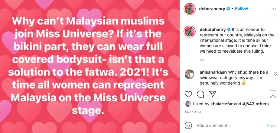 “Bukankah itu penyelesaian kepada fatwa. 2021! Sudah tiba masanya semua wanita dapat mewakili Malaysia di pentas Miss Universe,”- tulisnya di Instagram.