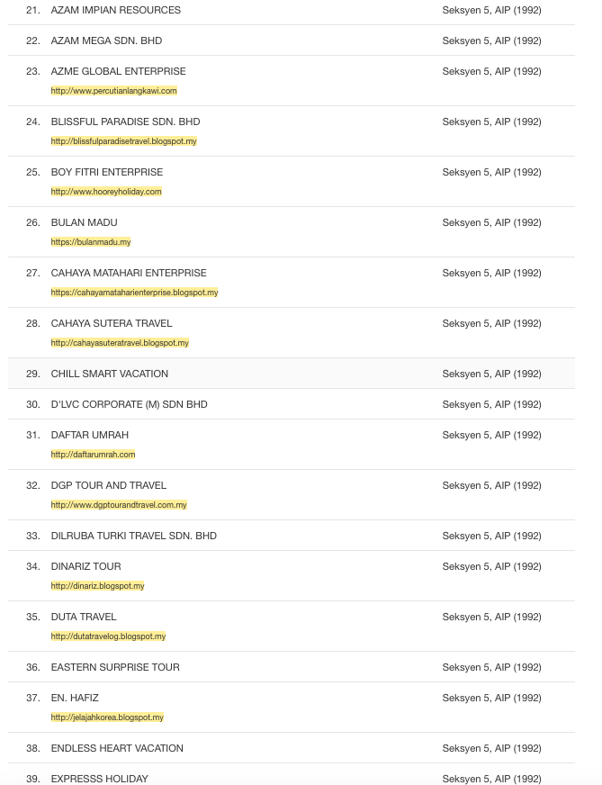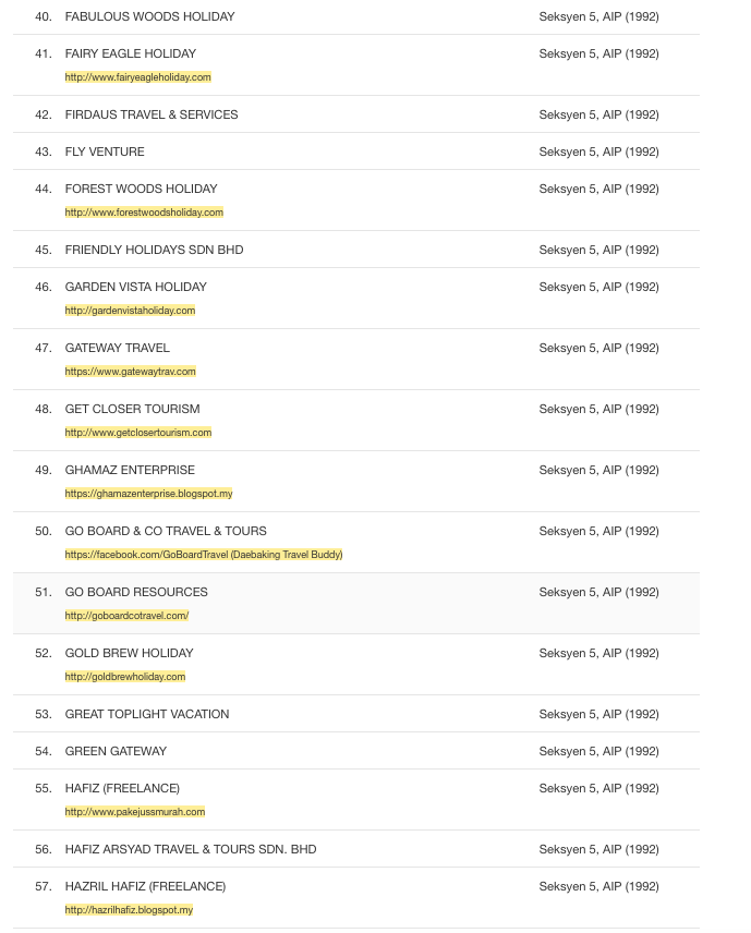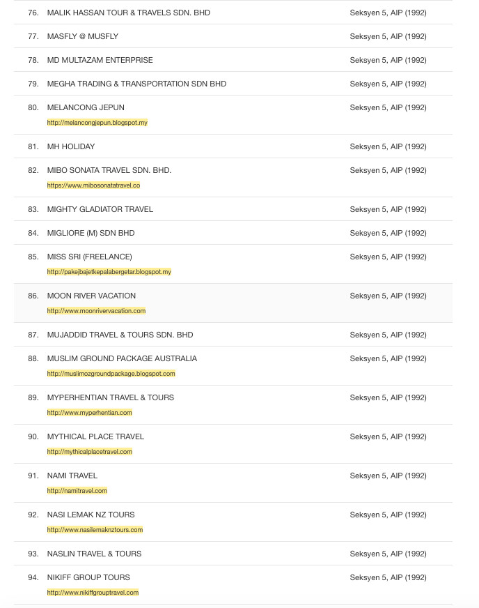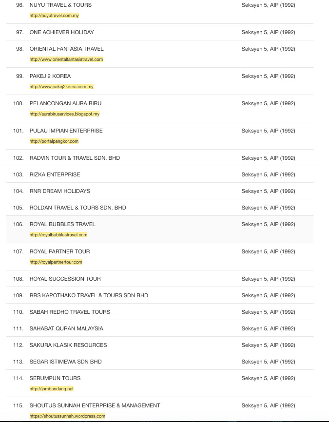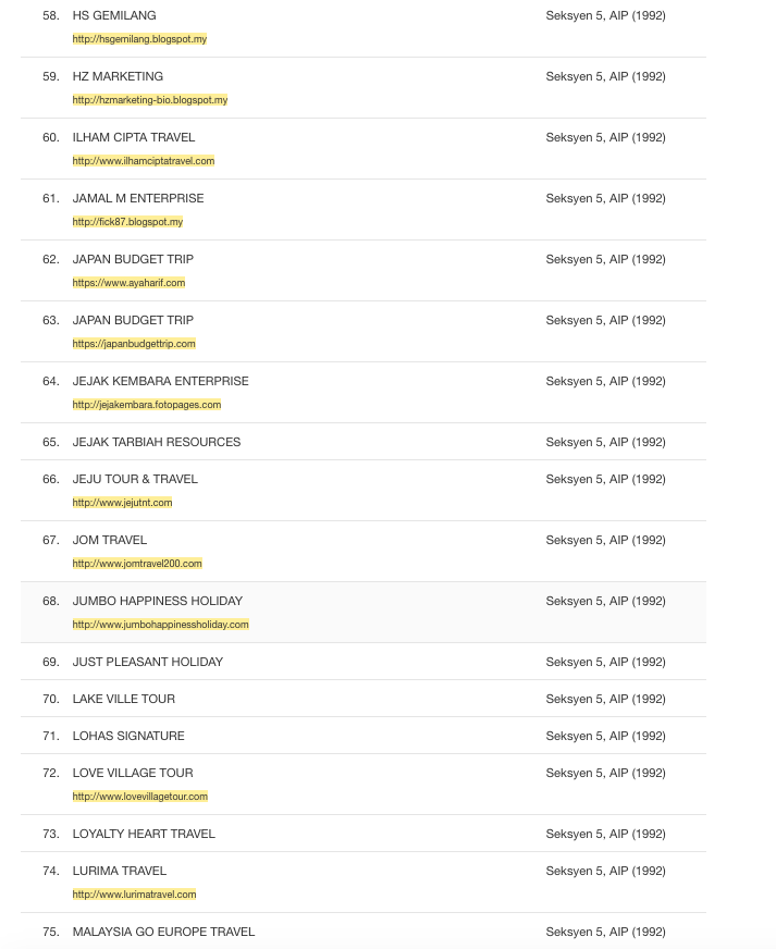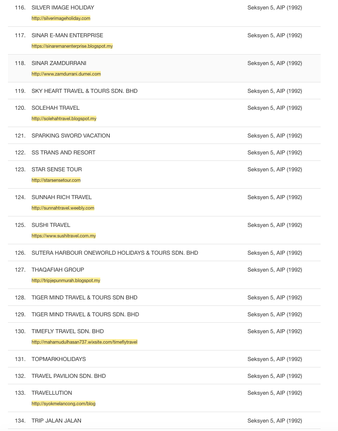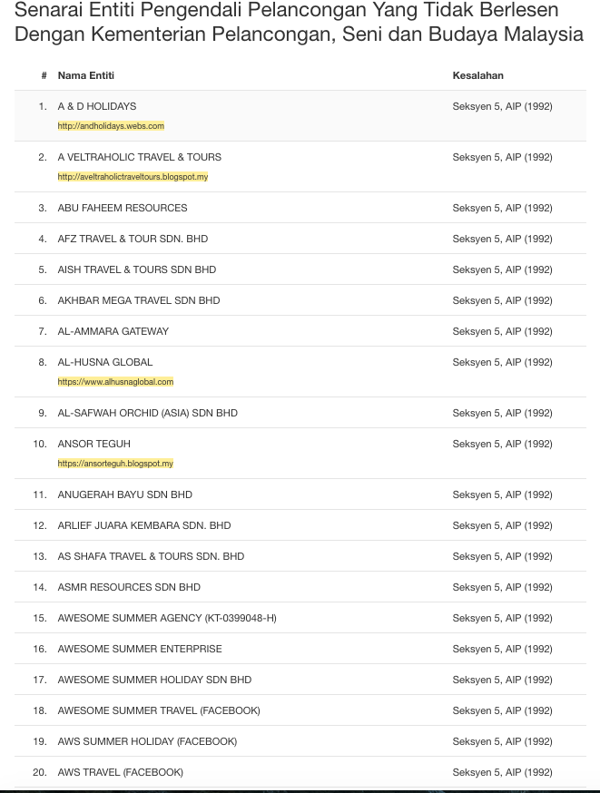 Untuk dijadikan sebagai panduan, berikut senarai syarikat yang tidak berlesen dengan Kementerian Pelancongan dan Kebudayaan Malaysia. Malah mereka didapati telah melanggar peruntukan Akta Industri Pelancongan 1992 kerana menjalankan perniagaan pelancongan tanpa lesen yang sah.