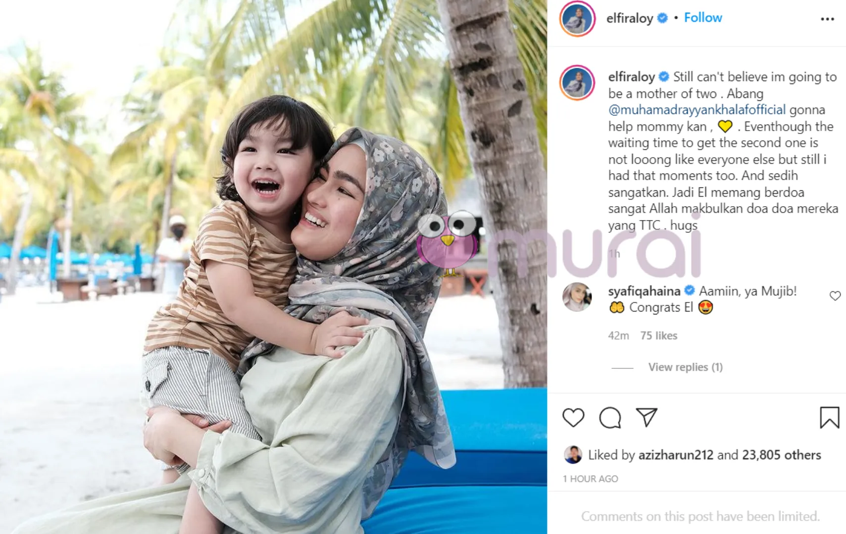 “Masih tidak percaya saya bakal menjadi ibu kepada dua orang anak. @muhammadrayyankalafofficial bakal bantu mommy kan.”- tulis Elfira