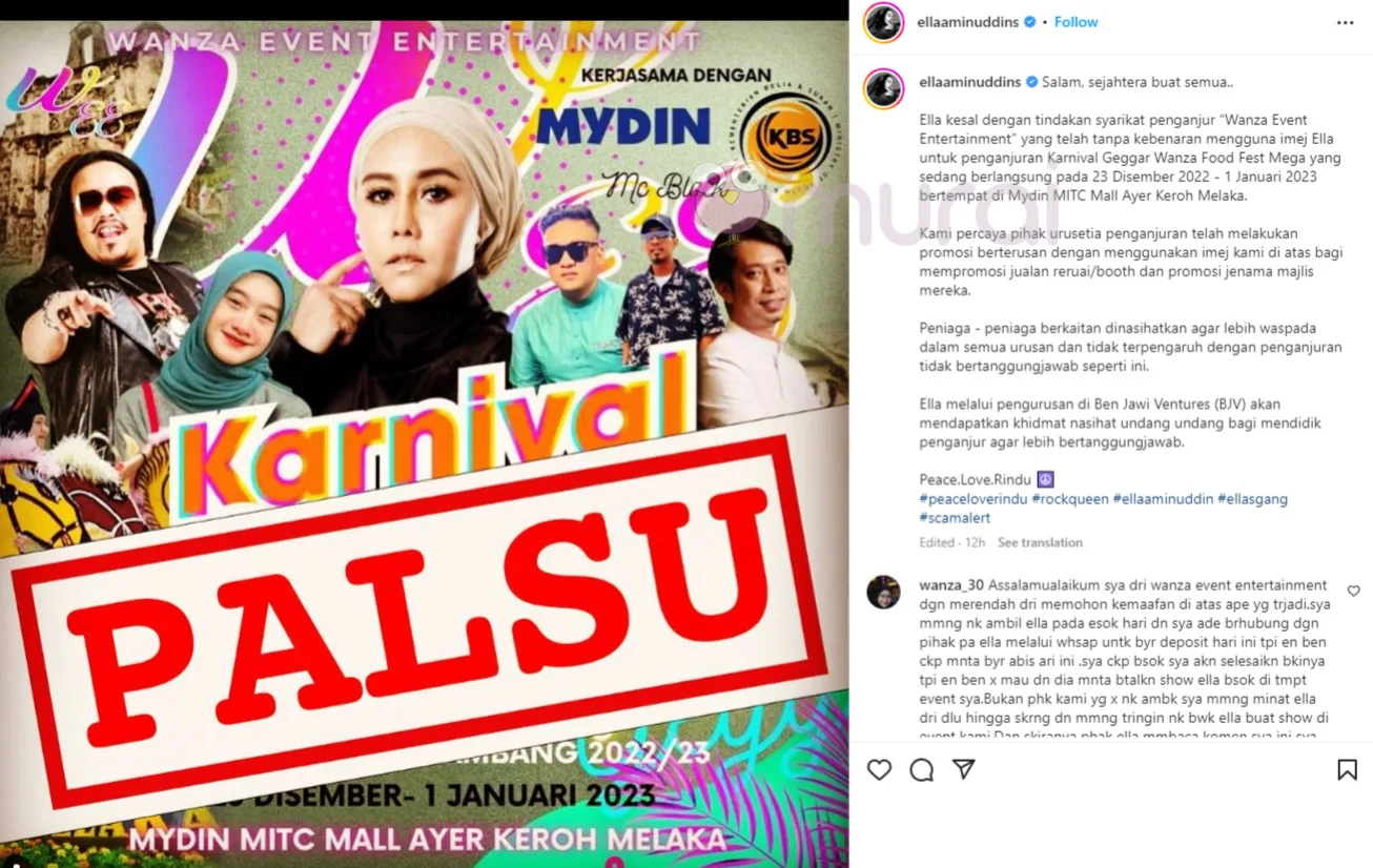 “Ella kesal dengan tindakan syarikat penganjur ‘Wanza Event Entertainment’ yang telah tanpa kebenaran mengguna imej Ella untuk penganjuran Karnival Geggar Wanza Food Fest Mega yang berlangsung pada 23 Disember 2022-1 Januari 2023 yang bertempat di Mydin MITC Mall Ayer Keroh, Melaka.
