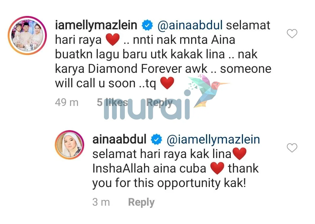 Selain mendedikasikan ucapan raya, Elly turut bersungguh dengan memberitahu akan ada wakil daripada pihaknya menghubungi Aina bagi berbincang lanjut mengenai kerjasama mereka kelak.