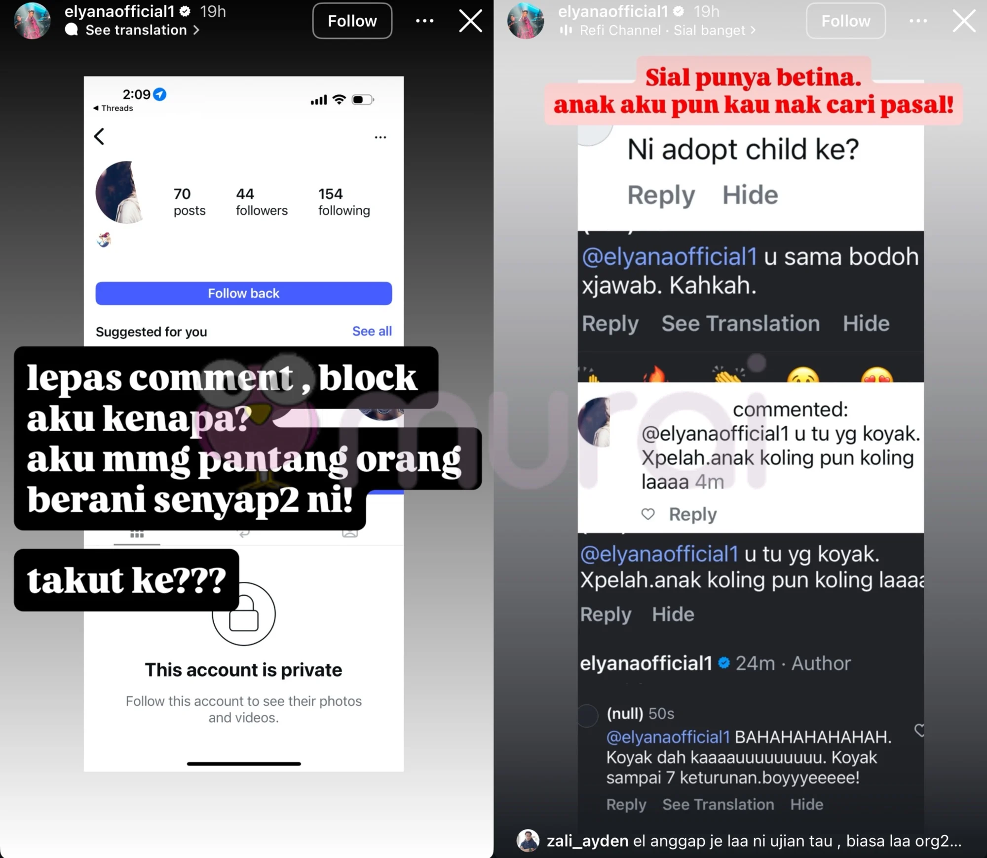 Pelakon dan penyanyi, Elyana meluahkan rasa berang terhadap tindakan salah seorang netizen yang bersikap biadap dengan mengutuk wajah anak angkatnya, Cahaya Ramadhani.