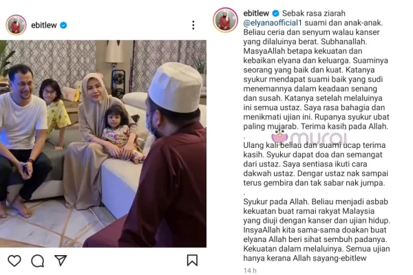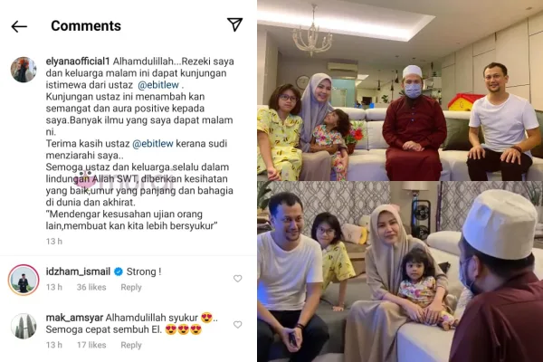 “Sebak rasa ziarah @elyanaofficial1 suami dan anak-anak. Beliau ceria dan senyum walau kanser yang dilaluinya berat. Subhanallah. MasyaAllah betapa kekuatan dan kebaikan Elyana dan keluarga. Suaminya seorang yang baik dan kuat.