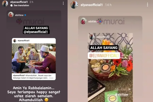 Penyanyi dan pelakon Elyana Emrizal mengatakan dirinya sekeluarga berasa sangat gembira dengan kunjungan ustaz Ebit Lew di rumahnya semalam. Menurut Elyana, kehadiran pendakwah tersebut secara tidak langsung menyuntik semangat serta aura positif kepadanya.