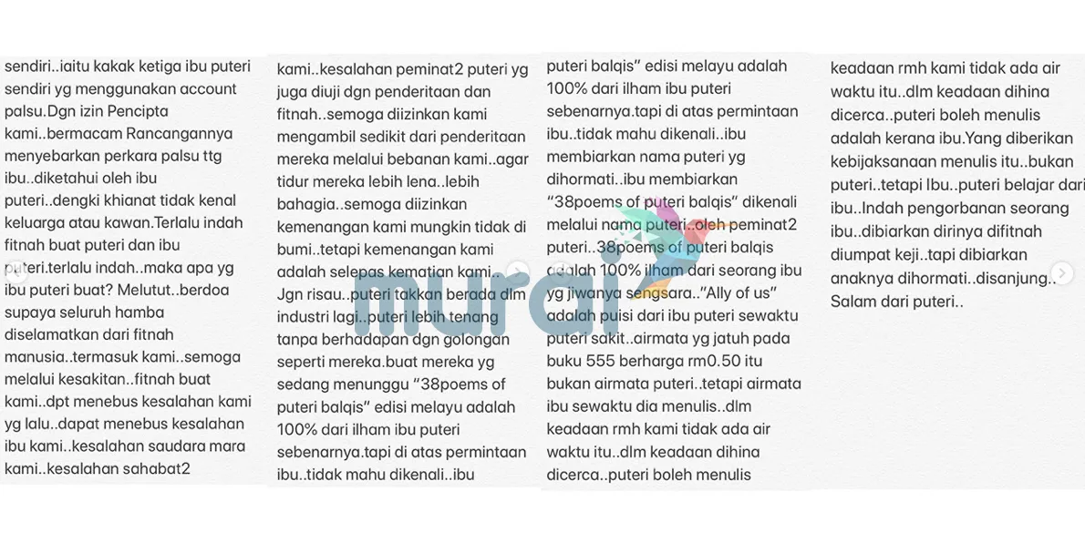 Dalam nukilannya itu, Balqis begitu mengagumi pengorbanan ibunya selama ini dan turut mendedahkan ibunya pernah mengalirkan airmata di dalam penulisan puisi yang berjudul ‘The Ally Of Us’.