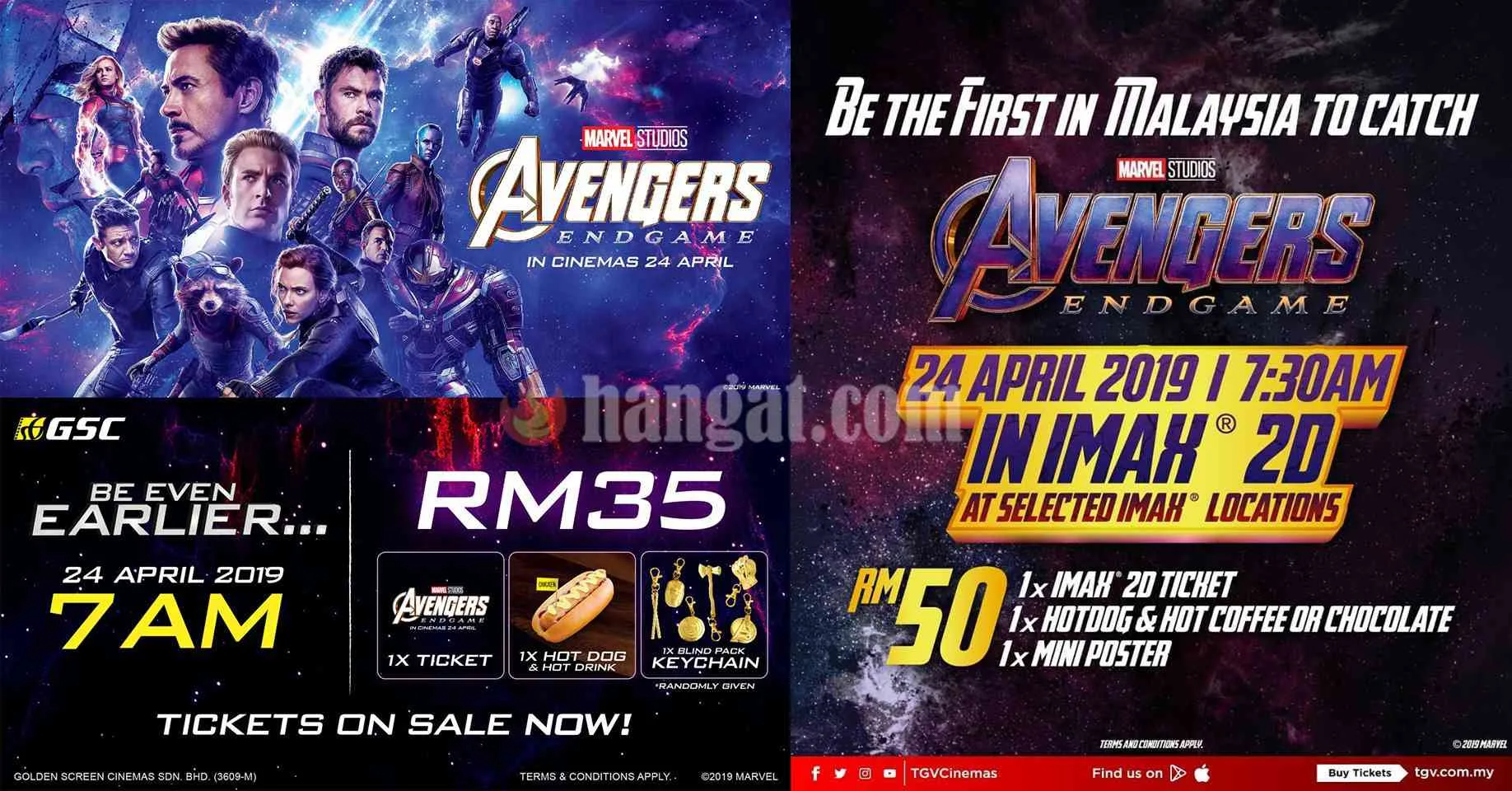 Peminat di tanah air sedia maklum bahawa dua jenama pawagam ternama akan memulakan tayangan awal pagi pada 24 April 2019 dimana GSC akan menayangkan tayangan seawal jam 7 pagi dan diikuti oleh TGV pada 7.30 pagi.