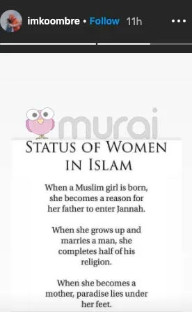 “Ketika seorang gadis Muslim dilahirkan, dia menjadi alasan ayahnya memasuki syurga. Ketika dia membesar dan menikah dengan seorang lelaki, dia menyelesaikan separuh dari agamanya. Ketika dia menjadi ibu, surga terletak di bawah kakinya,” tulisnya.