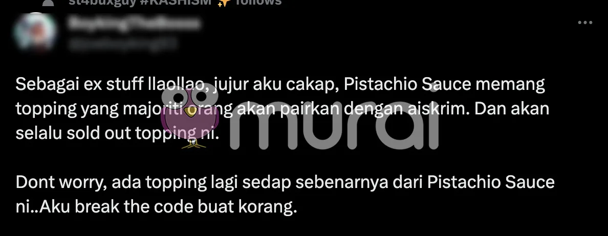 “Dont worry, ada topping lagi sedap sebenarnya dari Pistachio Sauce ni”- tulisnya di laman twitter.
