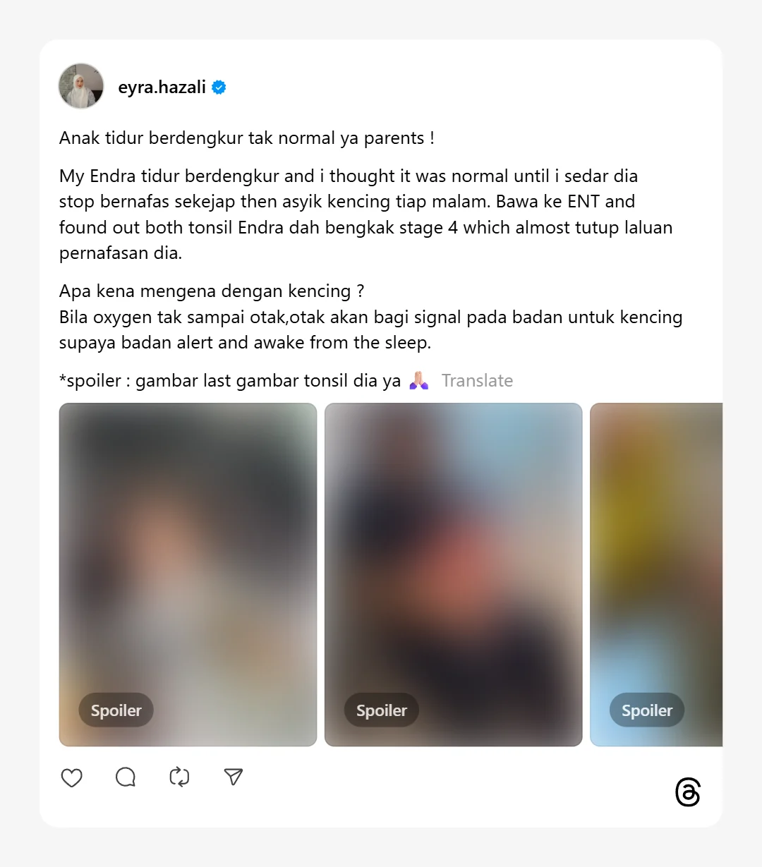 Kongsi Eyra atau Hazirah Qasdina Hazali di Threads, dia pada mulanya menyangka Endra berdengkur ketika tidur itu normal, namun setelah melihat anak lelakinya itu pernah berhenti nafas seketika dan mula kencing malam membuatkannya membawa Endra berjumpa dengan pakar telinga, hidung dan tekak (ENT) untuk mengetahui keadaan sebenar anaknya itu.