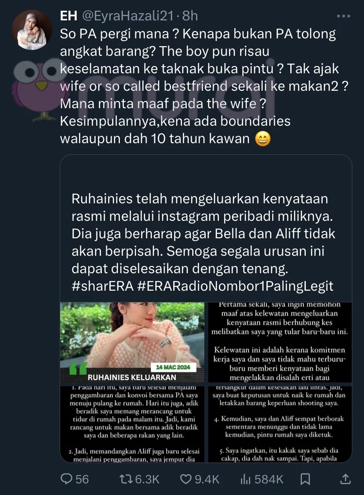 Kesimpulannya, kena ada boundaries walaupun dah 10 tahun kawan.”-tulis Eyra Hazali di X