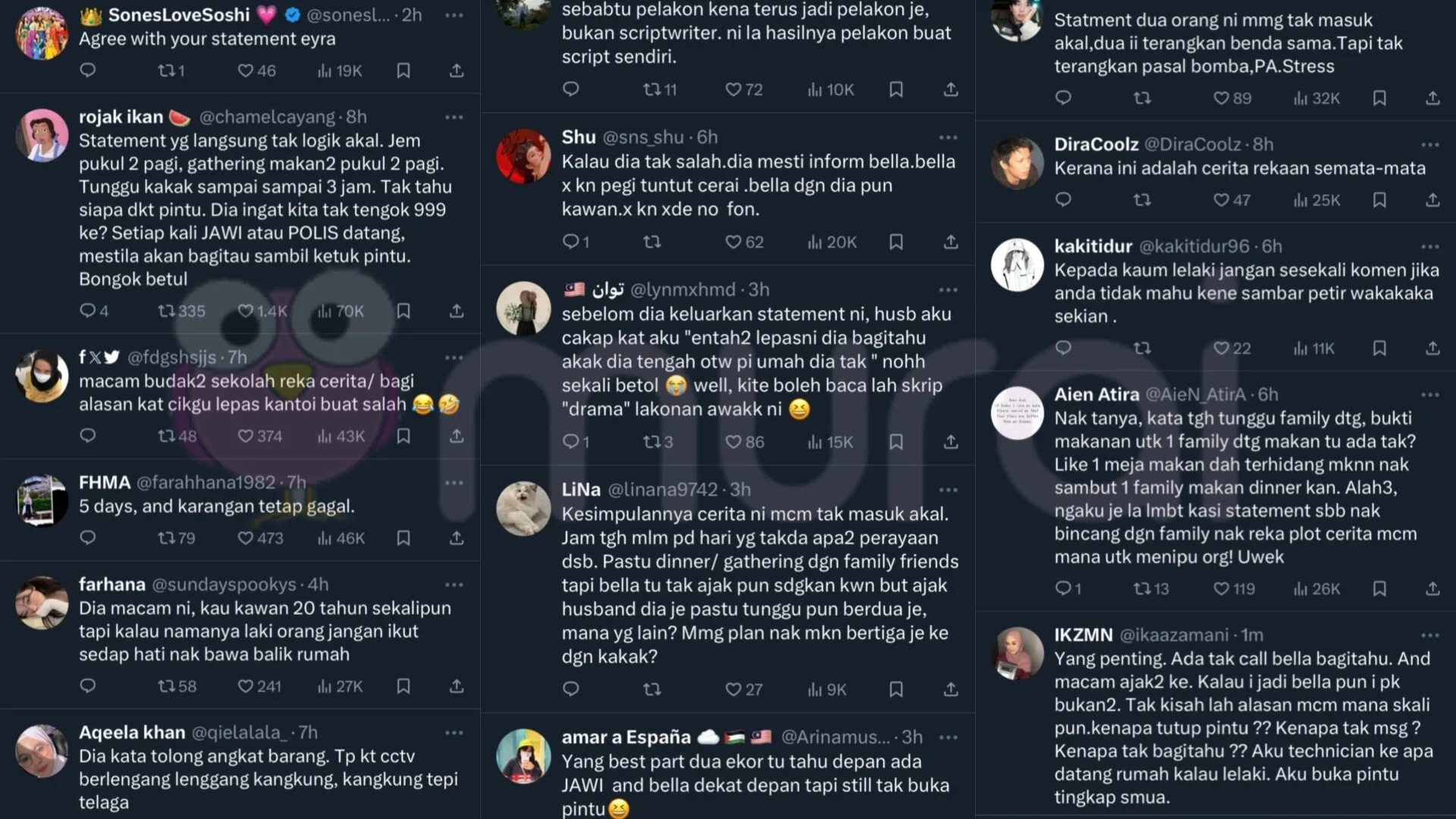 “Statement yang langsung tak logik akal. Jem pukul 2 pagi, gathering makan-makan pukul 2 pagi. Tunggu kakak sampai 3 jam. Tak tahu siapa dekat pintu. Dia ingat kita tak tengok 999 ke? Setiap kali JAWI atau POLIS datang, mesti akan bagitu sambil ketuk pintu.”