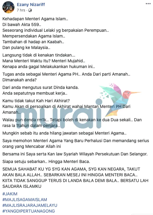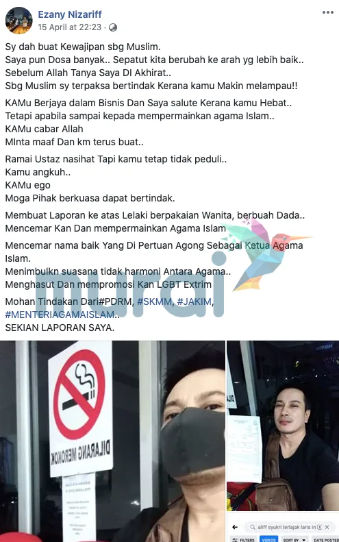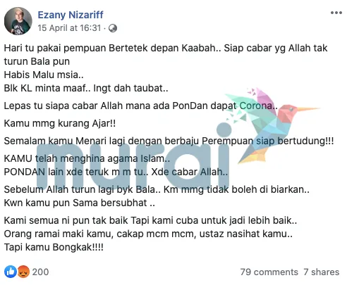 “Kamu berjaya dalam bisnes dan saya salute kerana kamu hebat.Tetapi apabila sampai kepada mempermainkan agama Islam. Kamu cabar Allah.Minta maaf dan kamu terus buat.Ramai Ustaz nasihat tapi kamu tetap tidak peduli.Kamu angkuh.Kamu ego. Moga pihak berkuasa dapat bertindak”